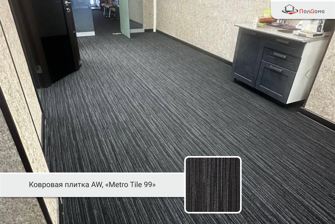 Для этого проекта мы остановились на бельгийской ковровой плитке от бренда Associated Weavers (AW) из коллекции Metro_Tile (артикул 99). Это не просто покрытие, а настоящий дизайнерский инструмент. В отличие от привычных квадратов, эта плитка выпускается в формате планок 25x100 см. Такой размер открывает массу возможностей для творчества: от классической «разбежки» до сложных геометрических узоров.